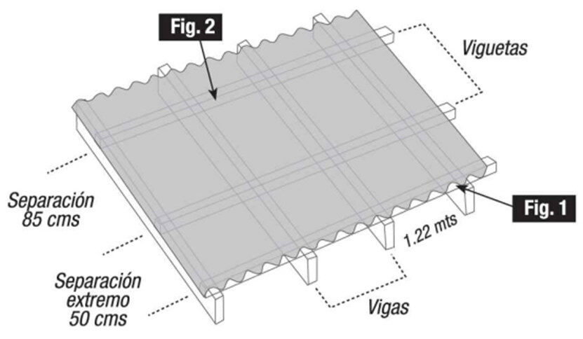 Se recomienda que la separación entre viguetas sea de 90 cms del borde de la cresta y surco y de 1.22 mts al centro del tramo.