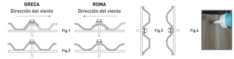 En instalaciones verticales se debe sujetar a través de los valles (Figura 3). Es recomendable fijar firmemente cada tercer ondulación, y en cada segnda ondulación en la cresta y el surco. Los elementos de unión deben estar sujetados sin utilizar excesiva tensión (espacio para la expansión) ya que uede dañar la lámiana. Posteriormente colocar sellador neutro base alcohol en cada una de las rondanas (Figura 4).